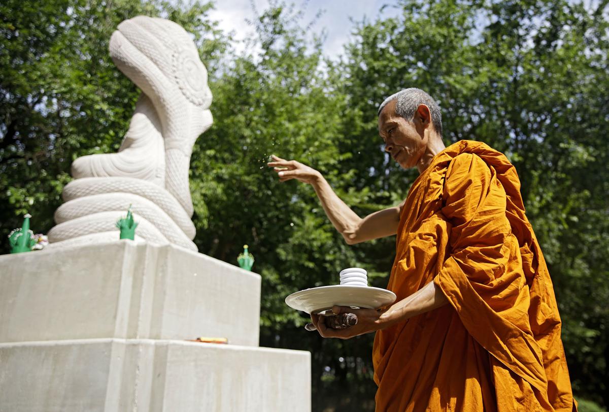 Buddhist monk Preecha Mechai throws grains and beans as an offering at the base of a new statue of Buddha at the Wat Tulsa Hansen Dhammanusorn Temple on Thursday. The temple, started at the beginning of 2016, is at 67th Street North and Trenton Avenue and practices Theravada Buddhism. On Thursday...