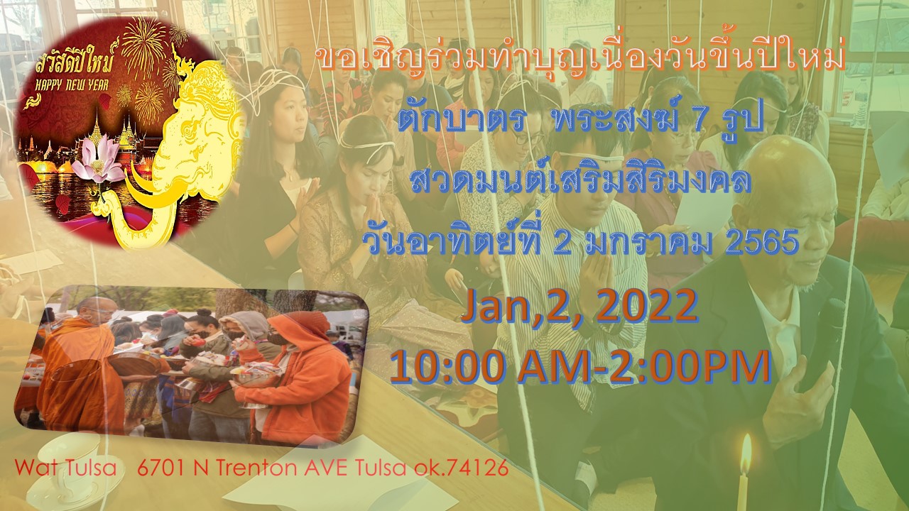 On Sunday, January 2 2022 Tulsa Hansen Dhammanusorn Temple invite you to join our merit New year ceremony between 10 AM to 2 PM. At the event, there will be Buddhist prayers, receiving blessings and offering food to monks.