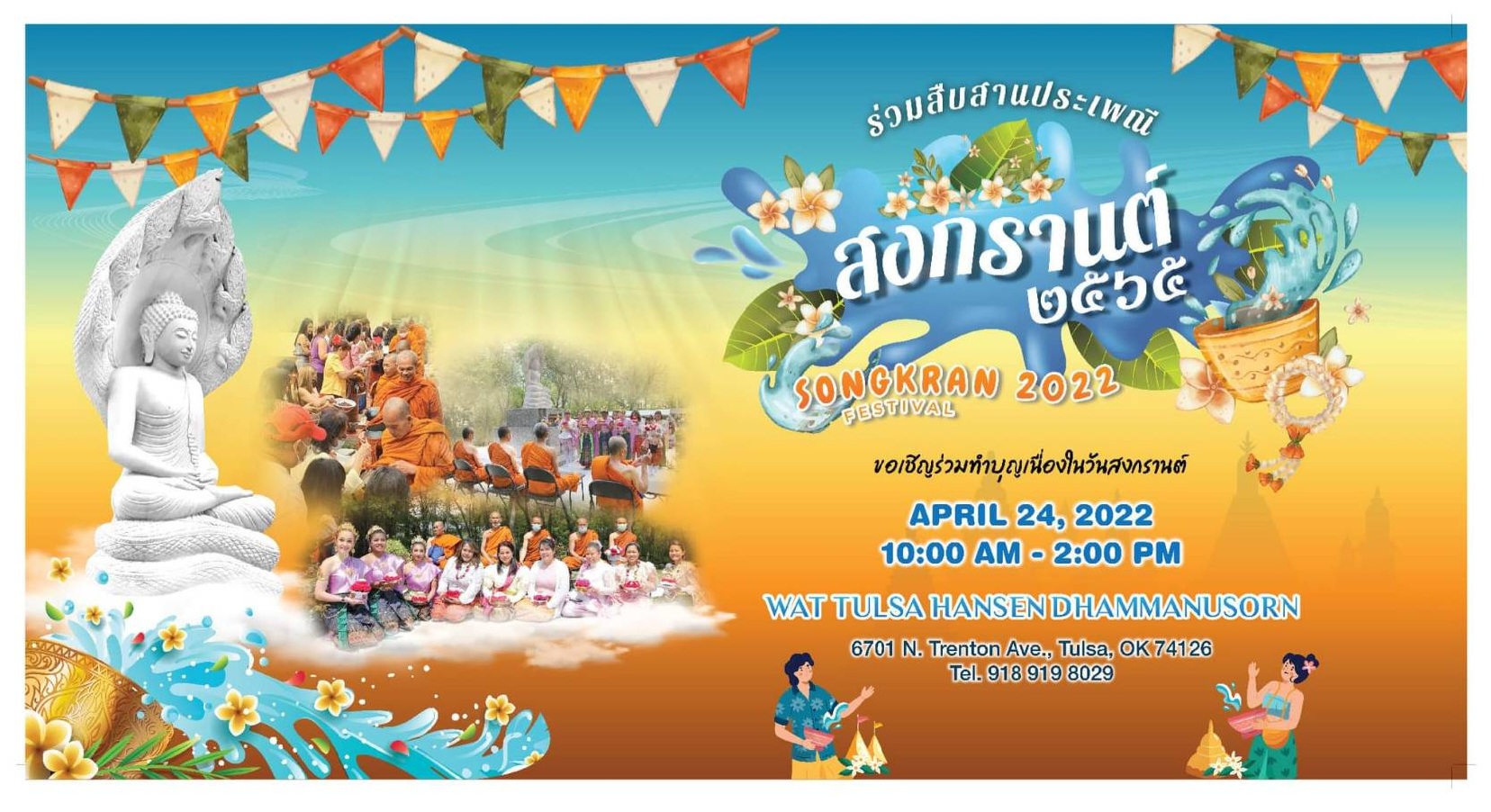 Tulsa Hansen Dhammanusorn Temple would like to invite you to join our Songkran Festival on Sunday 24, 2022 at 10 PM